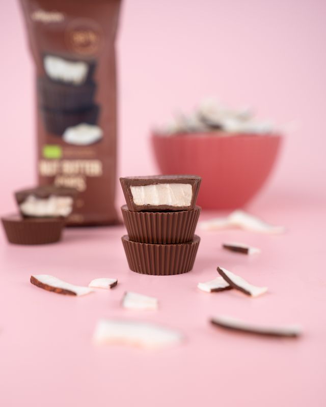 Vilgain Nut Butter Cups BIO jsou čokoládové košíčky s krémovou náplní. Základ tvoří neodolatelná kombinace ořechového másla zalitého lahodnou veganskou čokoládou.
